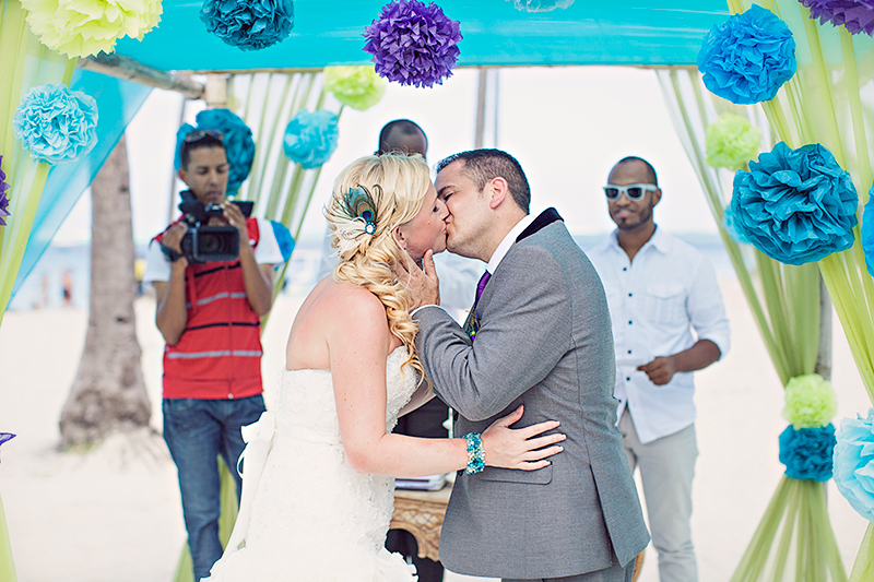 Lindsey & Scott er fra England, og giftet seg 4. april 2013, og var veldig glad for at vi anså deres dag som like vakker som de gjorde; og gjett om vi gjør! De har vært sammen i 16 år, og dermed hatt en ganske lang forlovelse. De har tre barn sammen; Connor, Jake og Macy (what a pretty name!), som var med til Karibien, sammen med brudens bror Simon, og hans kjæreste Lucy. Bruden er slående vakker i sin Morilee kjole, påfuglfjær med de turkise og lilla fargene, minner oss på hvorfor vi elsker farger. Ansvarlig for hår & make-Up: Krysta Ann, har også vunnet Bride's Choice Awards 2013, utropt av den fine bryllupssiden i USA; Weddingwire. Brudeparet med følge bodde på det fabelaktige Dreams Resorts & Spas.