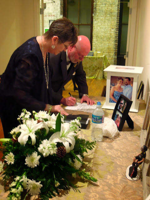 Ashley of Ashley's Cakes arrived the same time Marty and I did and we got to watch them put this beautiful cake together. The bride and groom are avid bicyclers and the cute topper was perfect! Ricky, father of the groom and best man, signing the marriage license.